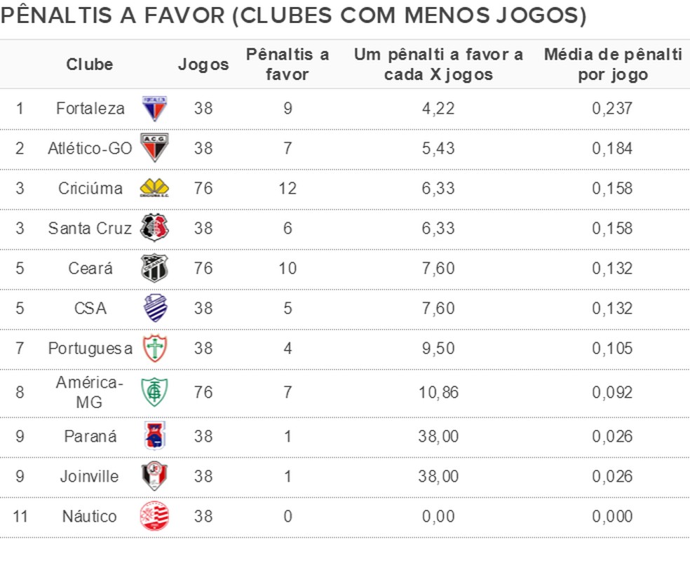 Os times foram organizados por média de pênaltis por jogo disputado, mas como é um número muito baixo, acrescentamos também no ranking a média de jogos para que cada time tivesse um pênalti marcado. A ordem é a mesma, só muda o ponto de vista da análise. Resolvemos deixar as duas marcas.