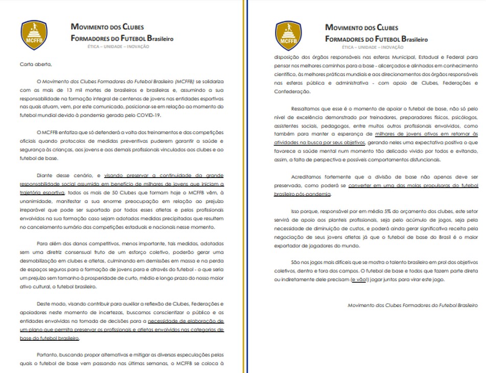 Nela, os dirigentes destacam o risco de demissões em massa e da "perda de espaços seguros para a formação de jovens para e através do futebol - o que seria um prejuízo sem tamanho à prosperidade de curto, médio e longo prazo do nosso maior ativo cultural, o futebol brasileiro".
