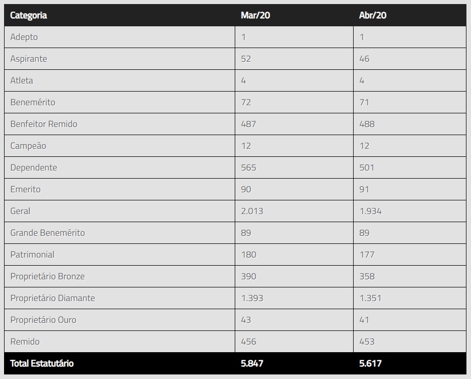 Veja abaixo a quantidade de sócios ativos no Gigante por categoria.