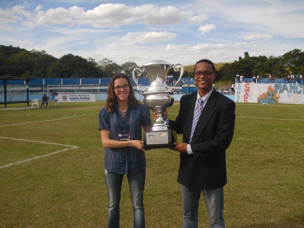 Ao lado da esposa, Ana Luíza, Sidnei exibe o troféu da Série B de 2014, conquistado com o Barra Mansa |