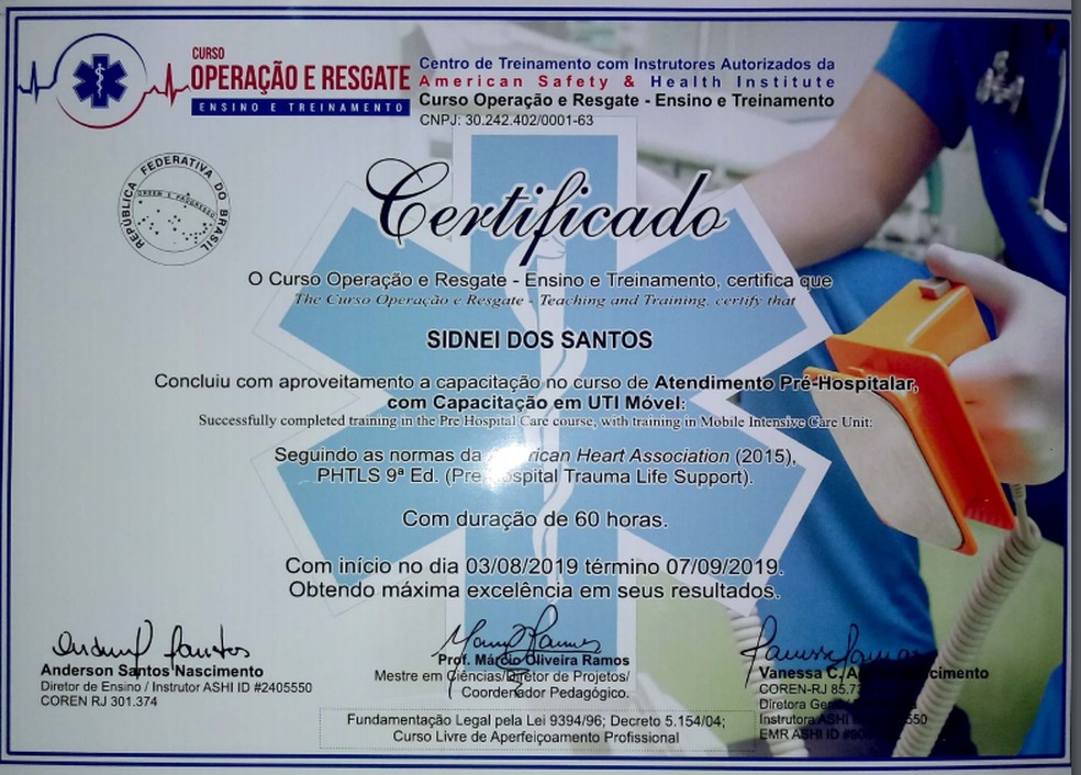 Confira um dos certificados de Sidnei. Fez curso especializado para condutores de veículos de emergência e nas área de necropsia e tanatopraxia; além de um Treinamento de Operação Segura de Motosserra e Desencarcerador |