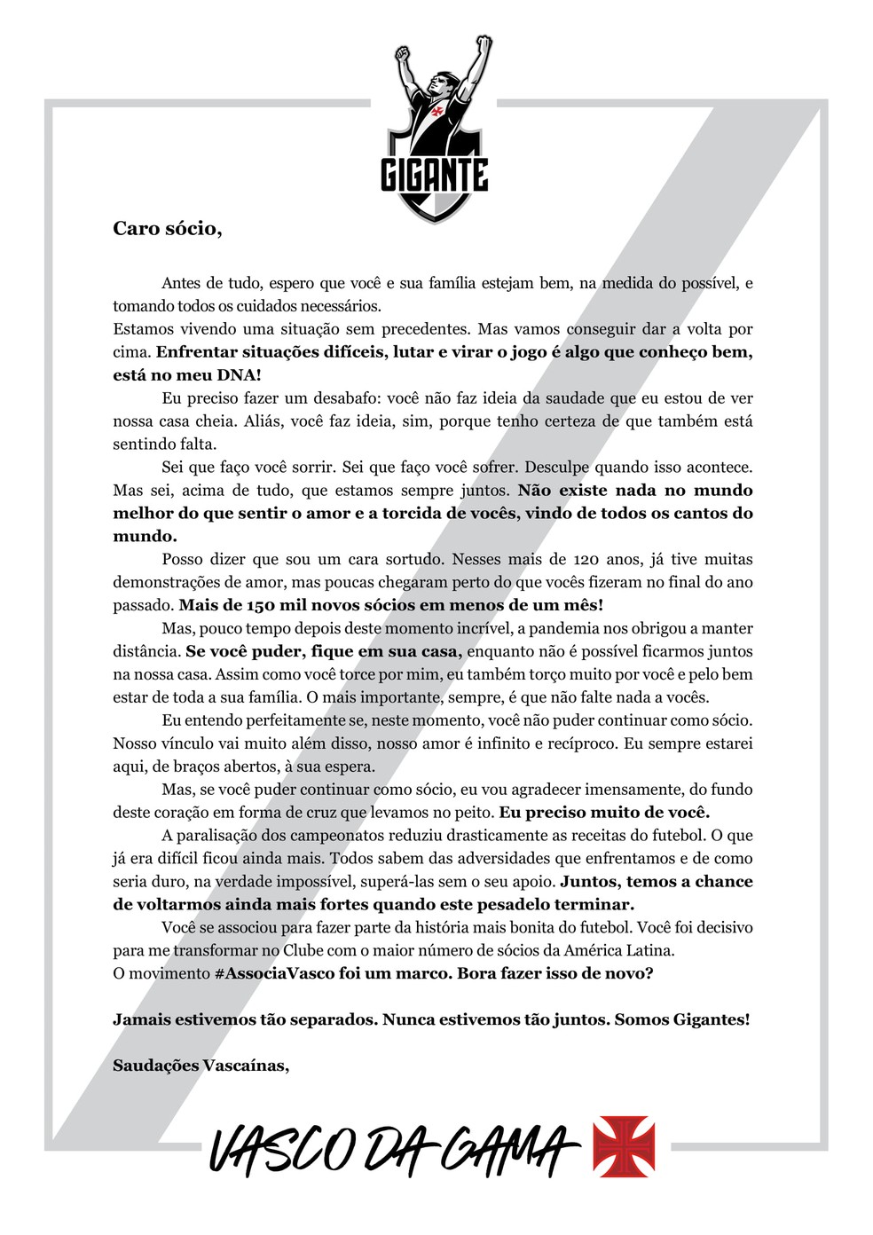 O Vasco enviou, nesta terça-feira, uma carta aos seus sócios pedindo a renovação dos planos contratados. Na mensagem, também disponibilizada em vídeo, o clube agradeceu pela associação de aproximadamente 150 mil pessoas no ano passado e explicou a importância de manter os pagamentos em um período de redução de receitas por conta da pandemia do novo coronavírus.