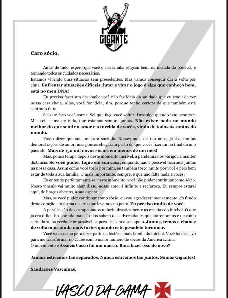Confira a carta enviada pelo Vasco aos sócios
