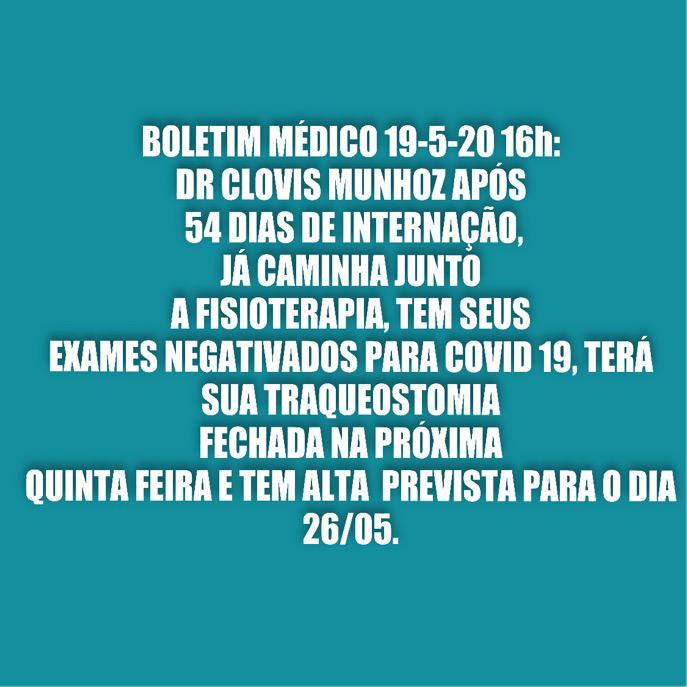 Dr. Clóvis Munhoz tem exames negativados pra Covid-19 e alta está prevista para dia 26