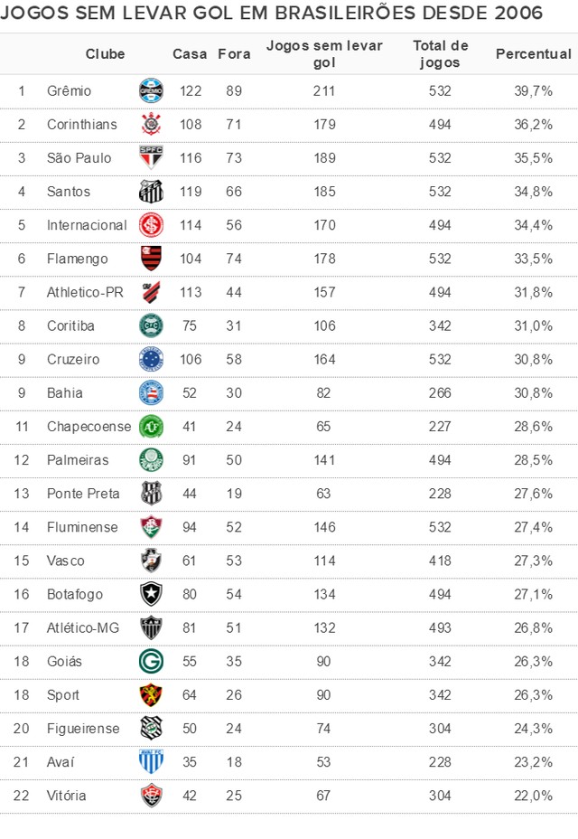 Grêmio, Corinthians e São Paulo são os clubes que mais vezes saíram de campo sem levar gol no Brasileirão por pontos corridos desde 2006, quando a competição passou a ser disputada por 20 equipes. O líder Grêmio é o único clube que não levou gol em praticamente 40% das vezes em que atuou. Em 532 partidas, o time gaúcho não levou gol em 211, sendo 122 quando mandante e 89 quando visitante, como mostra o quadro abaixo.