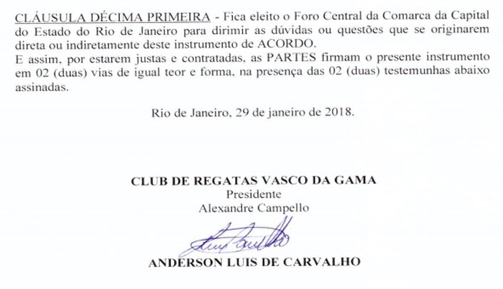 O Vasco alegou, em 9 de novembro de 2018, que não estava de acordo com o prosseguimento da cobrança pois o Instrumento Particular de Acordo (a rescisão) não tinha uma cláusula compromissória.