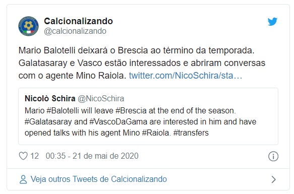 Na madrugada desta quinta-feira (21), o jornalista italiano Nicolò Schira trouxe uma informação no Twitter que agitou os vascaínos. De acordo com o repórter, o Vasco realmente tem tratativas em andamento para ter o craque. Ainda segundo a notícia, o Gigante da Colina está disputando o jogador com o Galatasaray, da Turquia. O polêmico atacante não quer mais continuar no futebol italiano. Mino Raiola, agente do "matador", já sabe da cobiça vascaína.