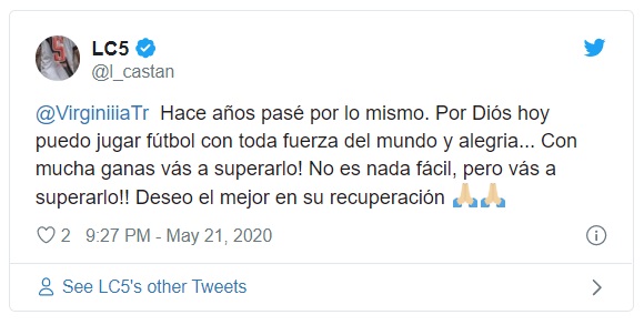 - Há anos passei pelo mesmo. Por Deus, hoje posso jogar futebol com toda força do mundo e alegria. Com muita vontade, você vai superá-lo. Não é nada fácil, mas vai superá-lo. Desejo o melhor em sua recuperação.