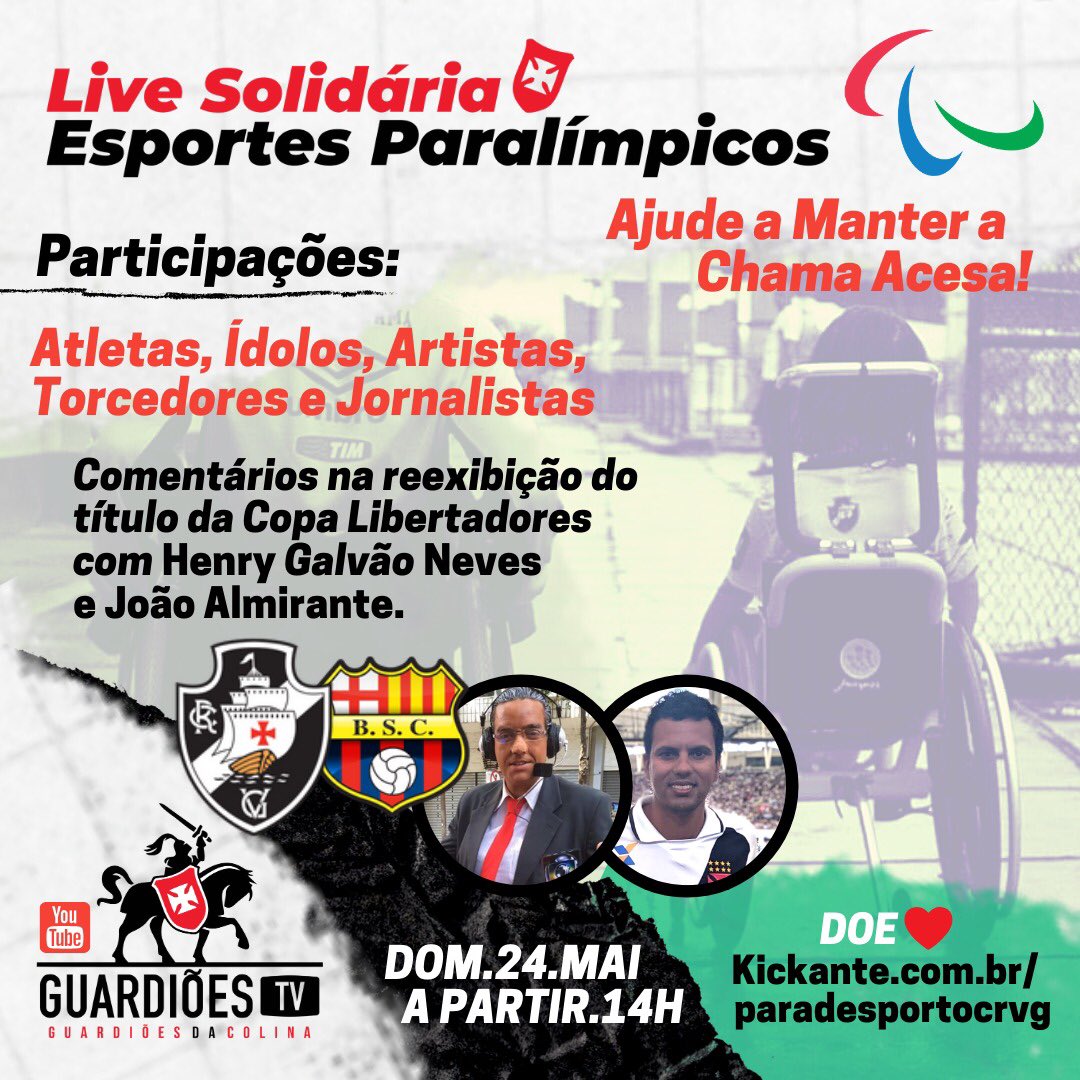 Como a maioria sabe, os esportes paralímpicos foram interrompidos no Vasco. Assim, o grupo Guardiões da Colina vai fazer uma Live Solidária no próximo domingo, a partir das 14h, para arrecadar fundos e ajudar a manter a modalidade no CEFAN.