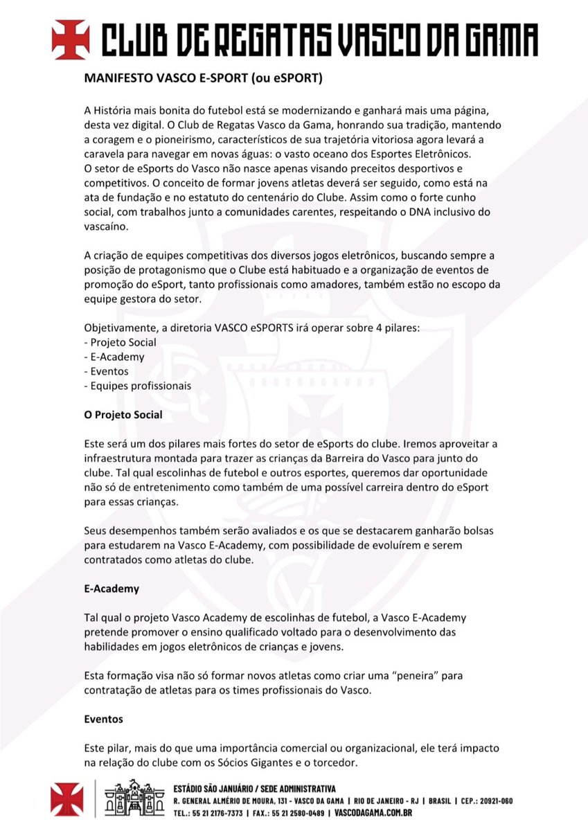 Fonte: Twitter do diretor de E-Sports do Vasco Carlos Gama