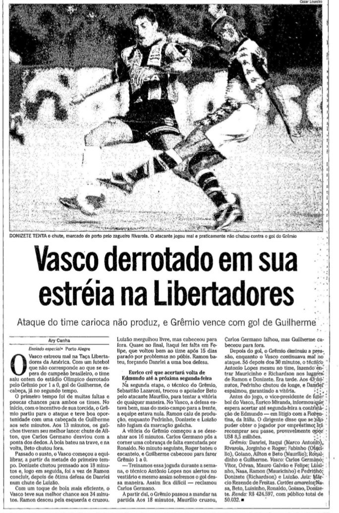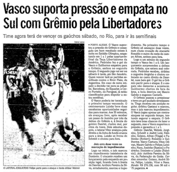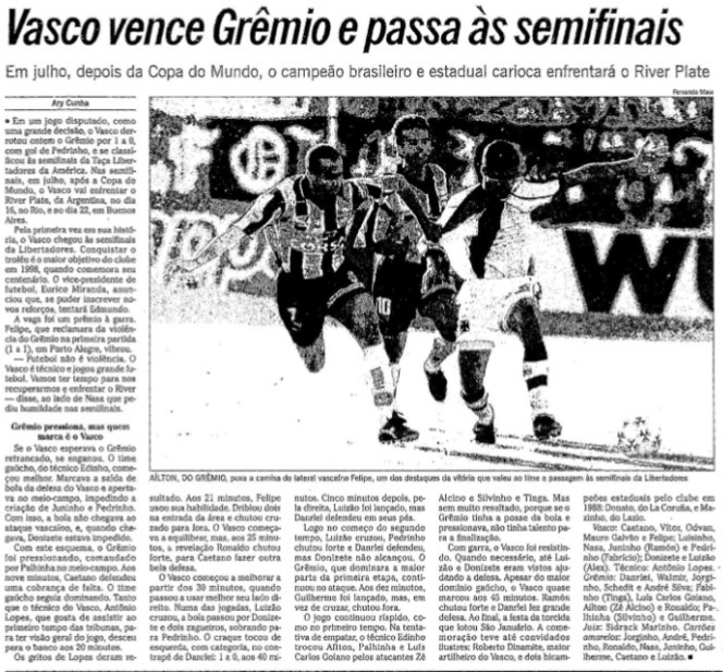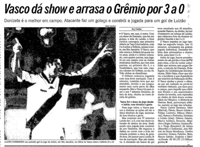 Donizete, melhor em campo naquele jogo: "O jogo contra o Grêmio foi muito importante. Ali começou a caminhada do título da Libertadores. Ganhamos de um time muito difícil. Foi uma atuação maravilhosa minha. Acho que uma das melhores na Libertadores. Ganhamos de 3 a 0 em casa. A torcida contou muito nessa campanha, por tudo que ela fez. O apoio que ela nos deu em São Januário"