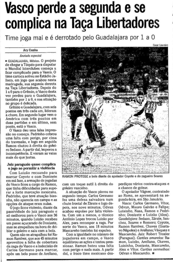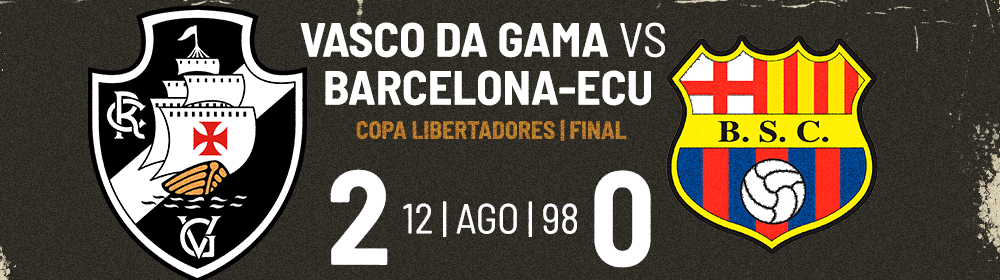 A conquista da Copa Libertadores em 98 é certamente a maior da gloriosa história do Vasco. Neste domingo (24/5), a TV Globo vai reprisar a grande decisão diante do Barcelona-EQU, às 16h, com a transmissão original: narração de Galvão Bueno, comentários de Falcão e Arnaldo Cezar Coelho e reportagem de Tino Marcos. O Site Oficial do Vasco convidou os jogadores Mauro Galvão, Odvan, Ramon, Vágner, Luizão e Donizte, que fizeram parte daquela campanha para relembrar, jogo a jogo, através de matérias do jornal O Globo da época.