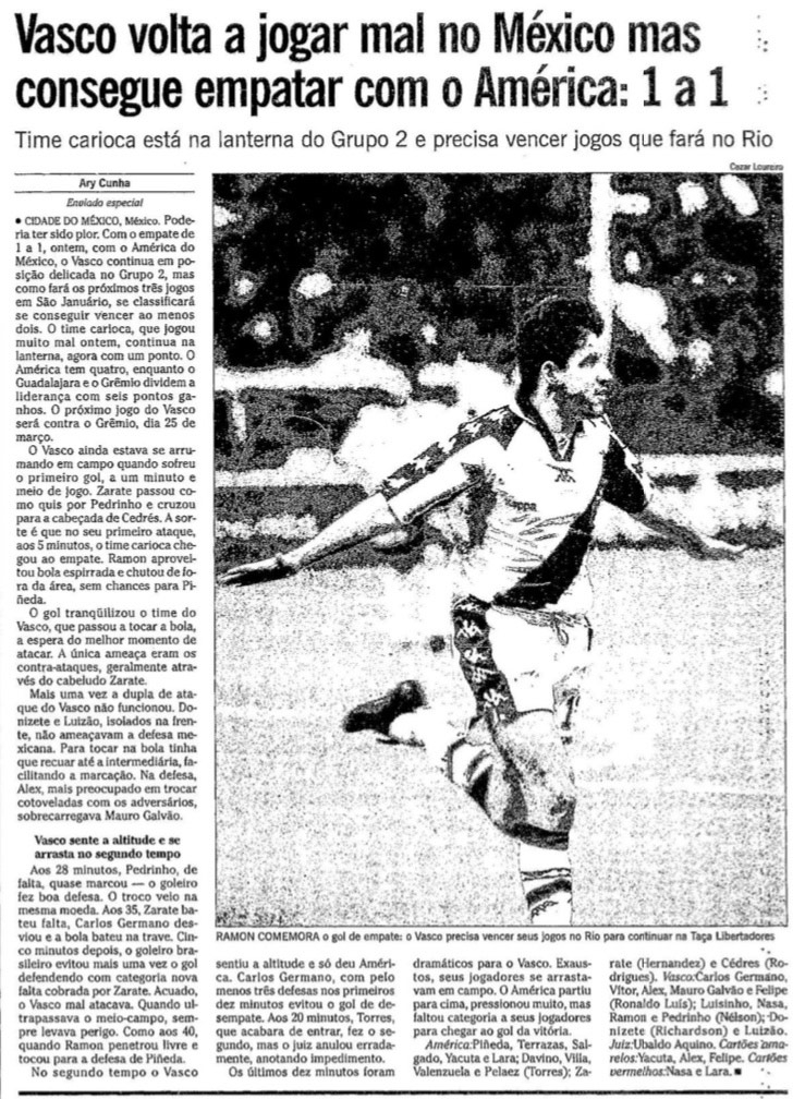 Ramon, autor do primeiro gol do Vasco na Libertadores: "Fazer o primeiro gol do Vasco na Libertadores é um orgulho e uma satisfação muito grande. Nós começamos mal e esse jogo se tornou decisivo. Era importante fazer pelo menos um ponto fora de casa e trazer a decisão dessa classificação para os jogos em São Januário. Esse gol foi muito importante pra mim e para que pudessemos ter tranquilidade para os jogos no Rio de Janeiro. No Caldeirão nós éramos muito fortes e vencemos os dois jogos seguintes, chegando no último já classificados"