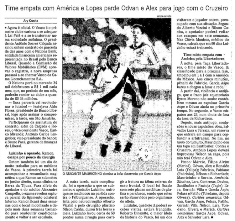 Vale ressaltar que o Club de Regatas Vasco da Gama iniciou, nesta quarta-feira (20/05), uma venda simbólica de ingressos para o segundo jogo da final da Copa Libertadores da América de 1998, contra o Barcelona-EQU. Os ingressos virtuais terão o valor único de R$ 10, e cada torcedor poderá comprar quantos bilhetes quiser. Toda a renda arrecada será destinada para pagamentos de salários do quadro de colaboradores do Clube. Confira todas as informações clicando aqui.