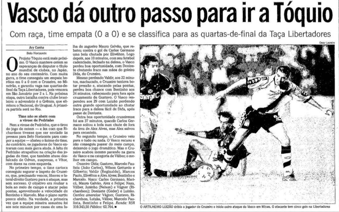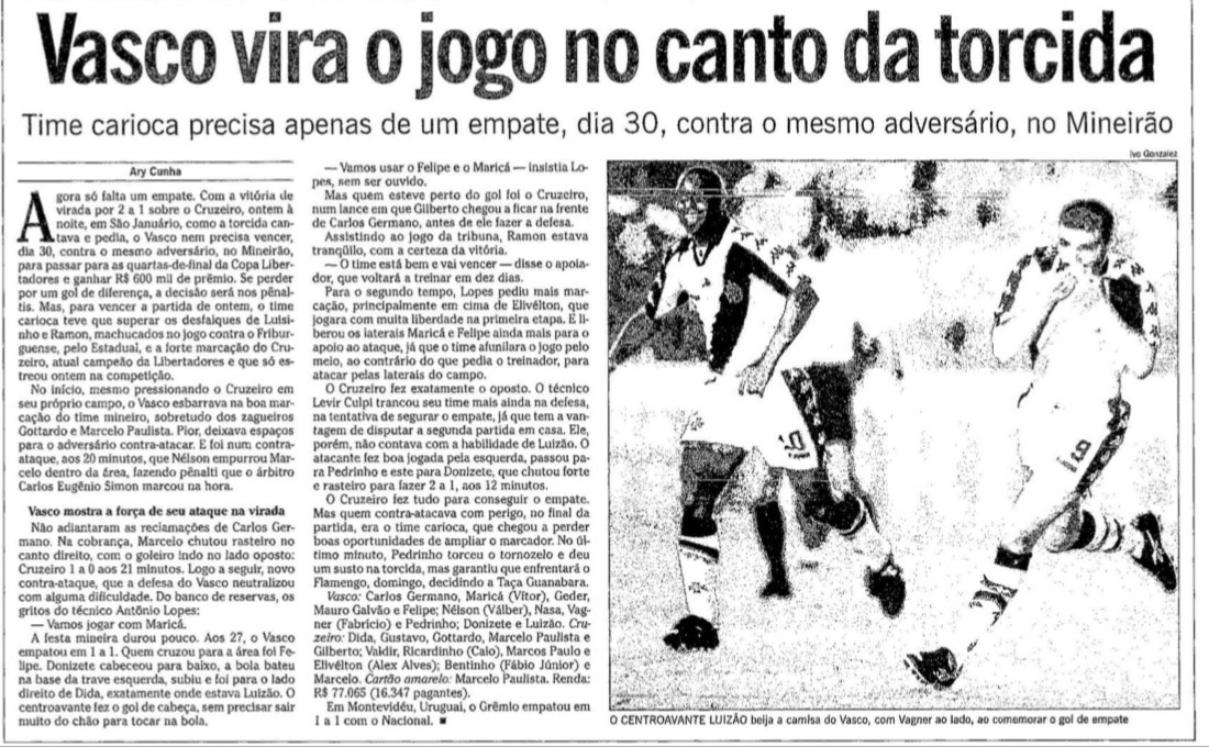 Vágner, coringa de Lopes na conquista: "Na minha opinião o Cruzeiro era o time a ser batido. Era uma equipe que jogava junto um bom tempo, estava super entrosada. Nós, do Vasco, tínhamos sim que nos impor fisicamente, porque a qualquer momento, pela qualidade do nosso time, alguém poderia decidir. Conseguimos segurar a vantagem e garantir a classificação"