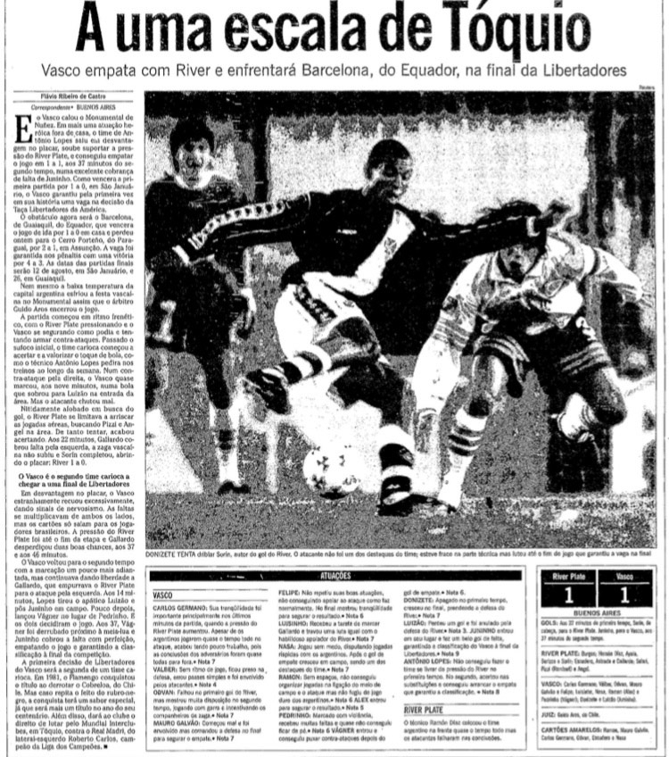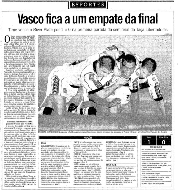 Donizete, autor do gol daquele jogo: "O primeiro jogo da semifinal contra o River Plate em São Januário o apoio da torcida foi fundamental. A torcida lotou São Januário e nos levou a vitória. Nos motivou, fez muita pressão e isso fez com que a gente saísse com a vitória. Foi um resultado importante para o jogo lá no Monumental a gente tinha uma vantagem e jogamos por uma bola. O Juninho fez aquele gol e nos classificamos"
