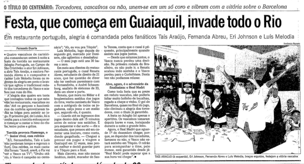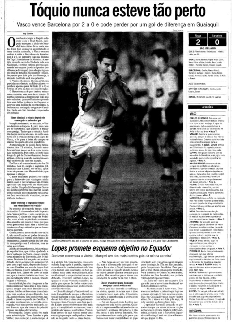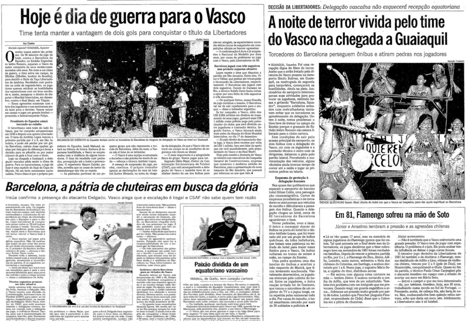 Mauro Galvão: "Nós tivemos problemas desde o primeiro minuto que pisamos em Guaiaquil. Eles passaram uma imagem para os torcedores e a imprensa de lá que tinham sido maltratados aqui, talvez pra justificar a derrota. No aeroporto e no hotel era uma barulheira insuportável. Atrapalharam nosso treino na véspera, mas sabíamos disso tudo. Era só assim que eles podiam ganhar. Como capitão, reuní o time e entramos ainda mais concentrados. Conversamos com os mais jovens, pra não entrarem na pilha. No estádio, o vestiário tinha fumaça, tinta pra atrapalhar. No campo eles atiravam pedras. Nós aquecemos no corredor do estádio. Sabíamos que nosso time era melhor e que se jogássemos futebol, o Vasco ia ganhar. Fico muito contente por ter tido a oportunidade em levantar o maior troféu que o Vasco já ganhou na história"