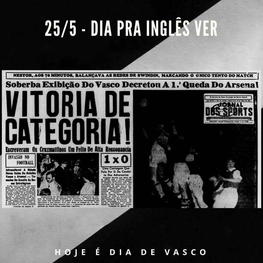Que Deus salve a Rainha, porque pro Arsenal, não teve jeito. A equipe inglesa era a mais poderosa do mundo e vinha invicta na excursão até bater de frente com o Vascão. São Januário foi palco da vitória por 1 a 0, gol de Nestor e de uma festa histórica. Aconteceu hoje, em 1949.