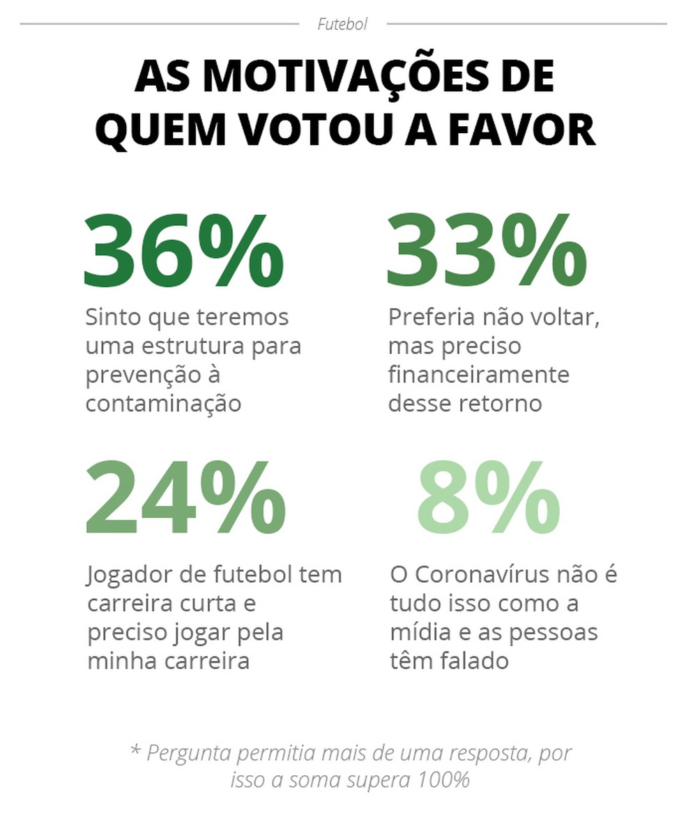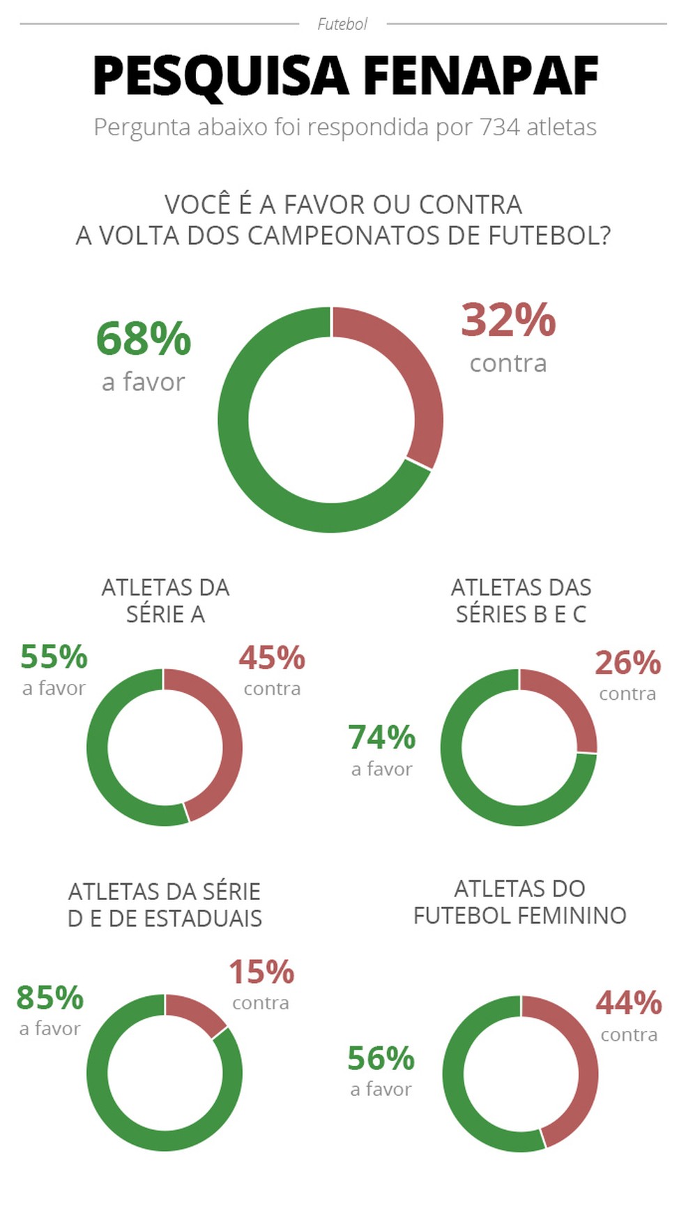 A pergunta "você é a favor ou contra a volta dos campeonatos de futebol?" foi respondida por 734 atletas que atuam em todos os estados do futebol brasileiro: 68% se disseram a favor, 32% responderam ser contra (não foi especificado o número de atletas ouvido por estado). A margem de erro é de 4%.