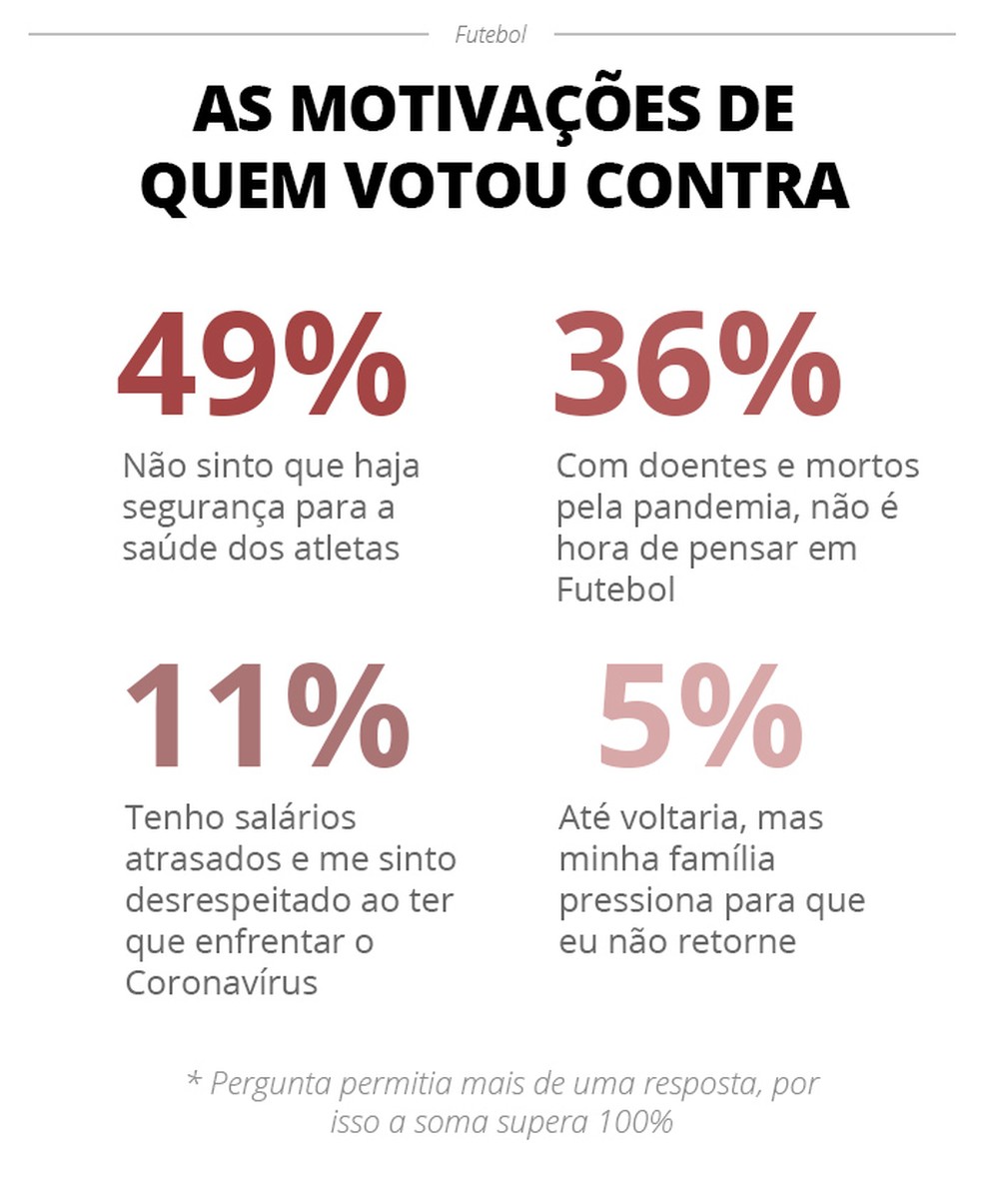 Entre os atletas que querem o retorno das competições, 33% disseram que não gostariam de jogar, mas que precisam disso para voltar a receber salário. Também houve 24% que citaram a curta duração da carreira. A soma desses fatores (57%) supera a resposta mais citada – 36% disseram confiar na estrutura que será montada para evitar o contágio.