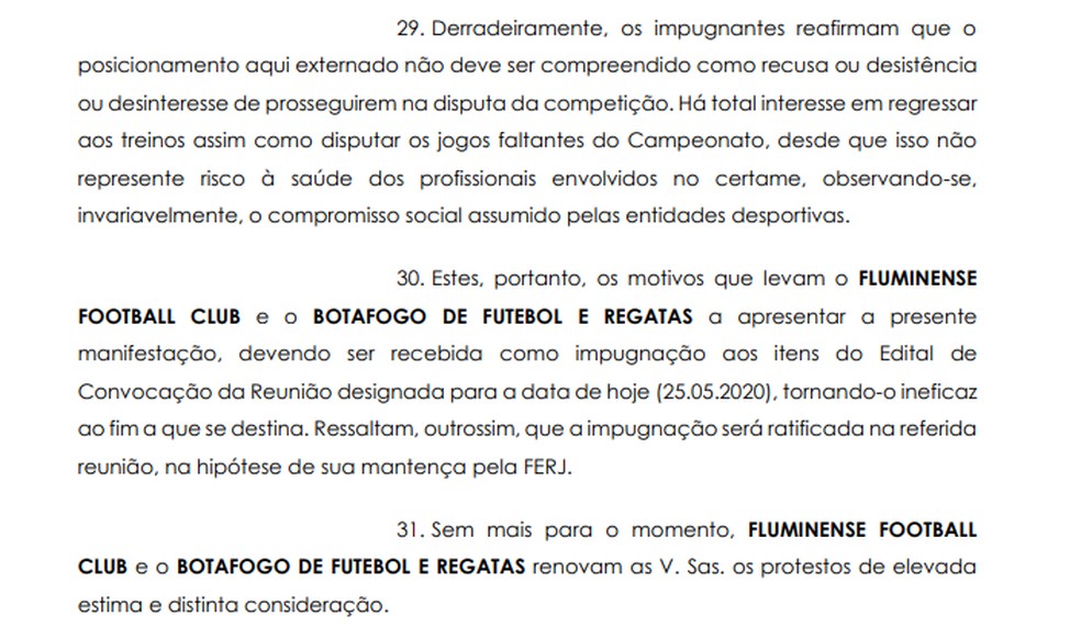 30. Estes, portanto, os motivos que levam o FLUMINENSE FOOTBALL CLUB e o BOTAFOGO DE FUTEBOL E REGATAS a apresentar a presente manifestação, devendo ser recebida como impugnação aos itens do Edital de Convocação da Reunião designada para a data de hoje (25.05.2020), tornando-o ineficaz ao fim a que se destina. Ressaltam, outrossim, que a impugnação será ratificada na referida reunião, na hipótese de sua mantença pela FERJ.