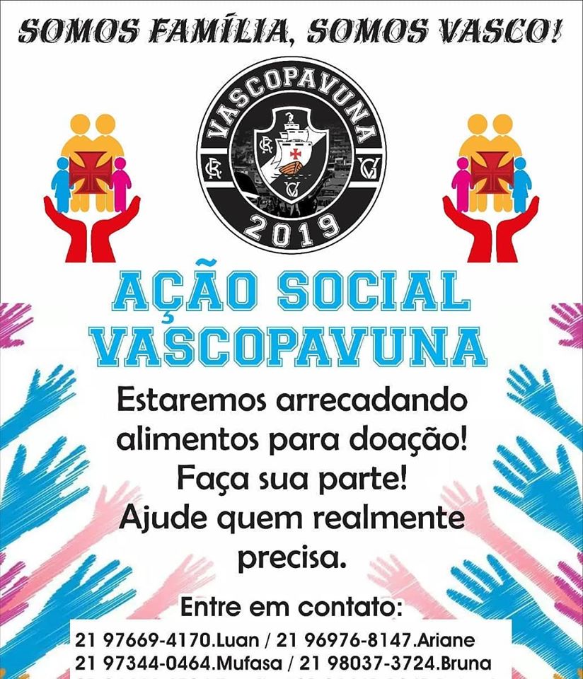 *Nós da VascoPavuna, vamos dar início uma ação social estaremos arrecadando alimentos para doar as famílias carentes. Contamos com a colaboração de nossos componentes e simpatizantes que poderem ajudar*.