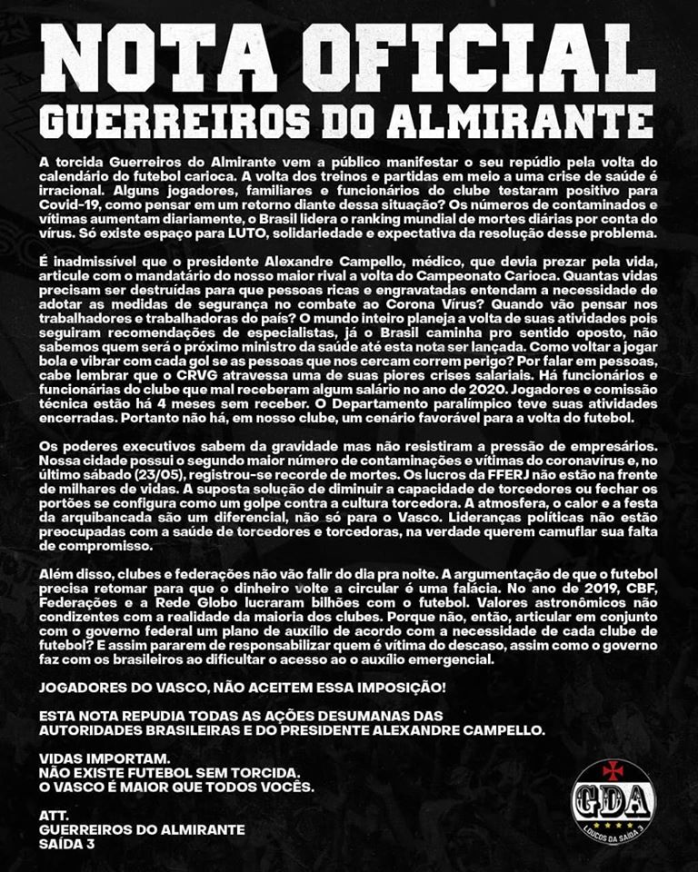 Em nota, Guerreiros do Almirante se posiciona contra a volta de treinos e jogos