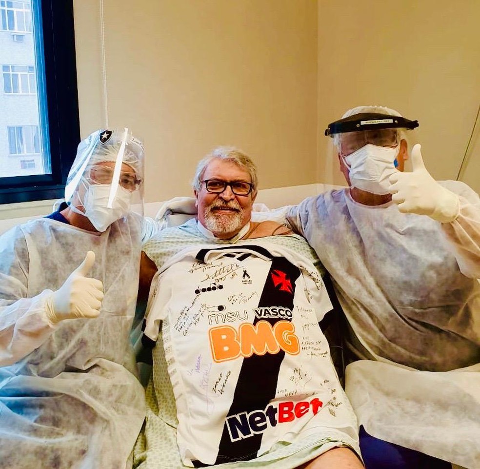 O coração vascaíno do médico Clóvis Munhoz está em dia e pronto para celebrar 70 anos de vida que completará no próximo dia 6. Após enfrentar um processo de 62 dias de internação por conta do coronavírus, Munhoz deixou o Hospital Copa D'or na última terça com direito a uma festa digna de craque do Vasco. Beijo da esposa (Monique), balões de festa, bandeira do clube e os tradicional grito de "Casaca" compuseram a saída triunfal.