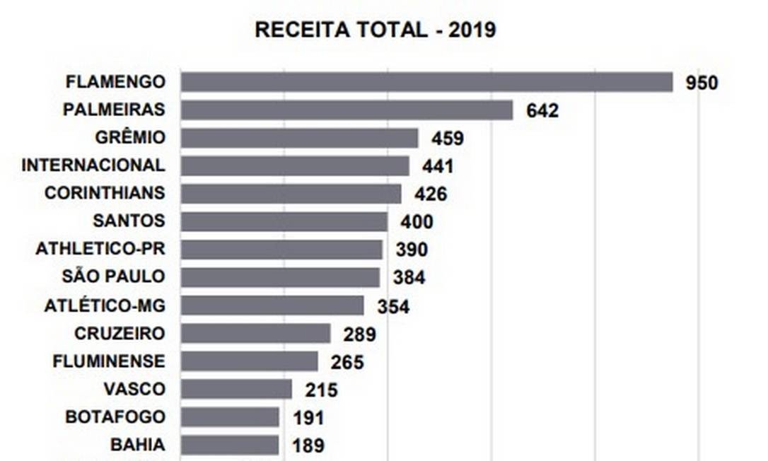 A maior arrecadação foi do Flamengo, campeão brasileiro e da Libertadores. Os R$ 950 milhões obtidos em 2019 representam 16% da receita total no Brasil. Verifica-se uma concentração de renda no topo da pirâmide. As cinco maiores receitas representam 50% do total. Além do Flamengo, elas são de Palmeiras (R$ 642 milhões), Grêmio (R$ 459 milhões), Internacional (R$ 441 milhões) e Corinthians (R$ 426 milhões).