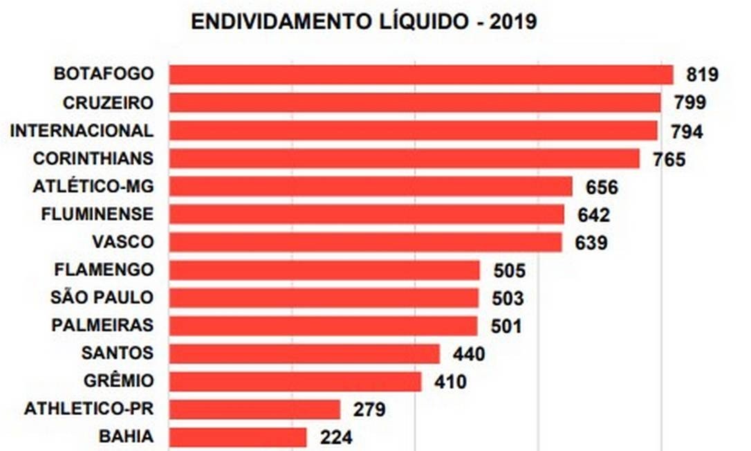 O aumento da receita, ao mesmo tempo, não indicou que os clubes controlaram os gastos, já que dez dos 20 principais clubes fecharam 2019 no vermelho: Internacional, Vasco, Atlético-MG, Fluminense, América-MG, Botafogo, Sport, São Paulo, Corinthians e Cruzeiro. Colocando todo o grupo dos 20 principais clubes na balança, o saldo é negativo: déficit de R$ 621 milhões.