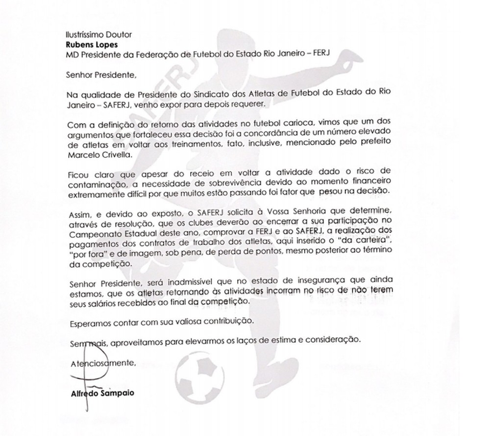 Nesse comunicado, o Saferj destaca que a crise financeira acarretada pela pandemia do coronavírus foi utilizada como argumento nas discussões para que as atividades fossem retomadas. Por isso, classificou como "inadmissível" o risco dos salários não serem pagos aos jogadores.