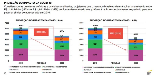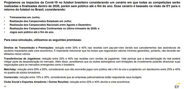 Consultora que atende alguns clubes brasileiros - hoje trabalha com o América-MG, Atlético-MG, Internacional, Grêmio, RB Bragantino (antes, auxiliou Flamengo e a CBF em trabalhos pontuais), a Ernst & Young fez novos cálculos com a premissa de que os jogos retornem no mês de julho, sem público.