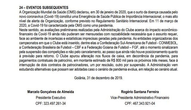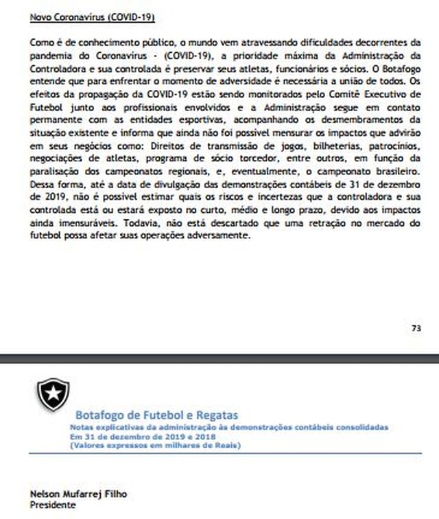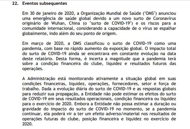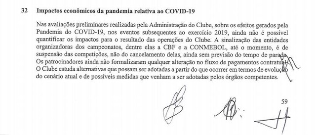 Na página 73, o texto assinado pelo presidente Nelson Mufarrej dizia que "não era ainda possível mensurar os impactos que advirão em seus negócios", nem no curto, médio ou longo prazo. Mas já avisava que uma retração no mercado do futebol afetaria suas operações adversamente.