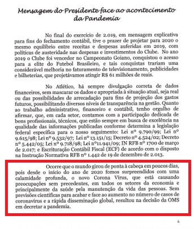 Na "mensagem do presidente face ao acontecimento da pandemia", Adson Batista trata de maneira franca sobre os efeitos do coronavírus. Projetava crescimento de R$ 19 milhões, em 2019, para R$ 61 milhões de receitas, em 2020. Mas "o mundo girou de ponto à cabeça em poucos dias", alertou o dirigente, que calculava perdas de R$ 4,1 milhões em 2020 com jogos de portões fechados e de R$ 5,4 milhões com a perda de patrocinadores.