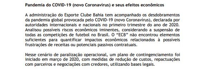 Em análise sobre os efeitos econômicos da pandemia, o Esporte Clube Bahia tratava "em cenário de paralisação operacional" de plano de contingenciamento. O que significaria "redução de custos, repactuações com parceiros e negociações com credores, utilizando bases legais."