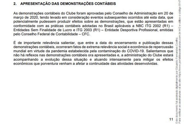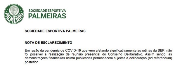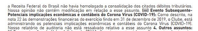 O clube paulista, segundo em faturamento no ano de 2019, tratava a Covid-19 apenas para registrar o motivo da não realização da reunião do Conselho Deliberativo para apreciar as contas. O mesmo registrou o São Paulo e o Sport.