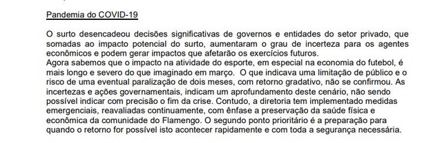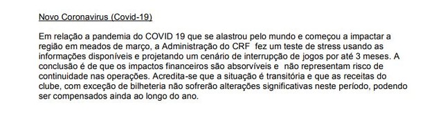 Com quase R$ 1 bilhão de receitas no super vitorioso ano de 2019, o Rubro-Negro sentiu o efeito do coronavírus no cofre e realinhou o discurso. Ainda no balanço, comunicou que "fez um testes de stress" com cenário de interrupção de jogos por três meses e concluiu: "os impactos financeiros são absorvíveis e não representam risco de continuidade nas operações".