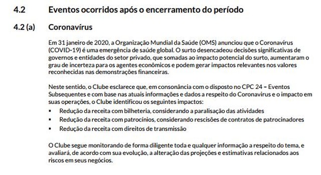 Na página 33 do balanço, o Tricolor anunciou três impactos diretos - na receita de bilheteria, de patrocínios e de direitos de transmissão - e avisou que seguiria "monitorando de forma diligente toda e qualquer informação a respeito do tema" e avaliaria alteração das projeções e estimativas relacionados aos riscos em seus negócios".