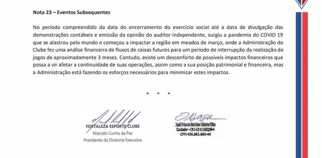 Entre os "eventos subsequentes" citados ao fim do relatório de demonstrações financeiras de 2019, o Fortaleza informava que fez análise financeira de fluxos de caixa para período de interrupção de jogos de aproximadamente três meses. E reconhecia "desconforto de possíveis impactos financeiros que possam a vir afetar a continuidade de suas operações".