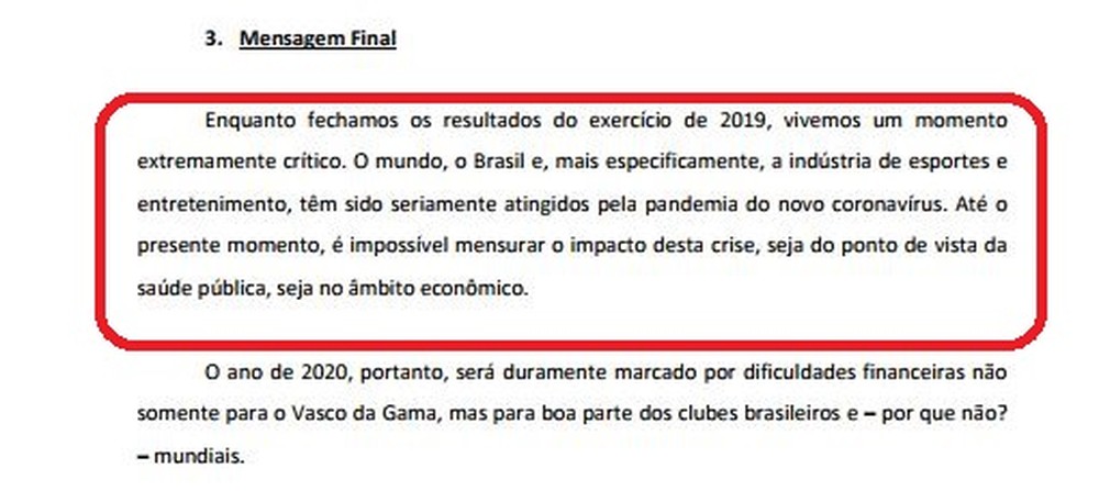 No relatório sobre as finanças do clube, o presidente Alexandre Campello considerava o "momento extremamente crítico" e comentava: "O ano de 2020, portanto, será duramente marcado por dificuldades financeiras não somente para o Vasco", comentando que na finalização do balanço já observava a redução de entrada de receitas