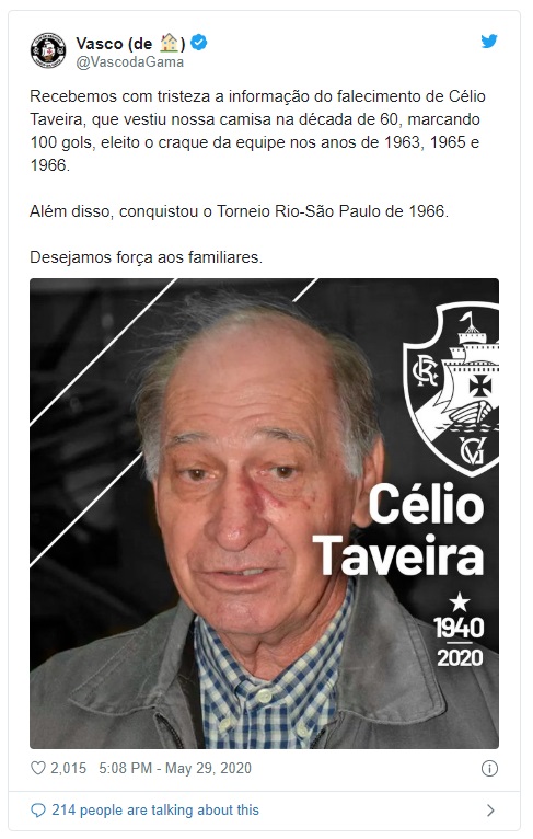 No Brasil, a referência se limitou a uma postagem do Vasco, já no fim do dia. Pelo menos fez. A CBF poderia ter feito. O Corinthians, último time de Célio, já em 1970, idem.