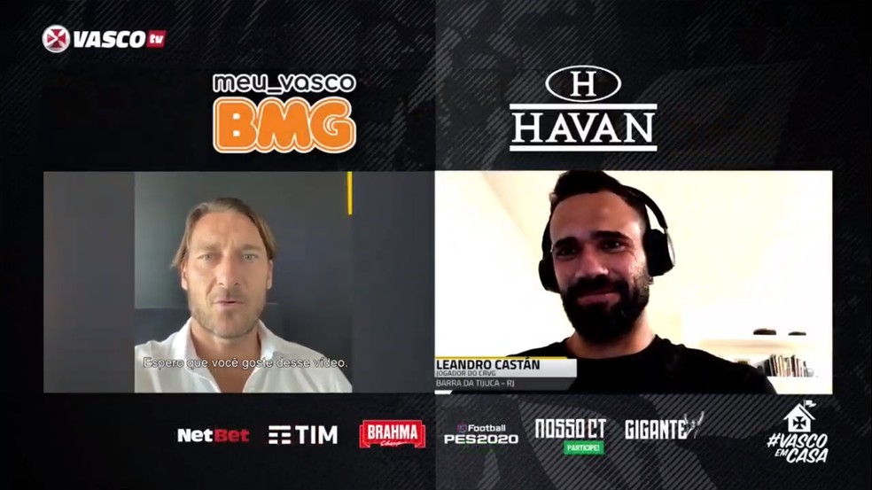 O Vasco manteve a rotinas de lives às terças e quintas-feiras no canal oficial do clube no Youtube, mas inovou e atravessou fronteiras após a coletiva de Leandro Castan. A Vasco TV exibiu depoimento de Francesco Totti, maior ídolo da Roma, clube onde foi companheiro do capitão vascaíno. E as palavras do italiano mexeram com o zagueiro de 33 anos.