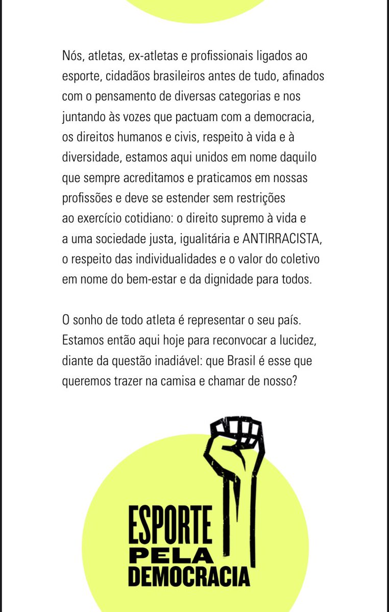 Integrado por nomes influentes de várias modalidades esportivas, o grupo "Esporte pela Democracia" lançou nesta terça-feira um manifesto em defesa dos direitos humanos, liberdade de imprensa, diversidade e valores democráticos. Entre as personalidades que assinam a carta estão a ex-nadadora Joanna Maranhão e o ex-jogador de futebol e comentarista Walter Casagrande, além de Gustavo Kuerten (tênis), Luciano Corrêa (judô), Ana Moser, Fabi, Fê Garay, Isabel, Pedro Solberg e Serginho (vôlei), Alex Pussieldi e Arilson Silva (natação), Grafite, Igor Julião, Juninho Pernambucano, Raí e Reinaldo Lima (futebol), os ex-árbitros Carlos Simon e Salvio Spinola e os jornalistas José Trajano, Juca Kfouri e Lúcio de Castro.