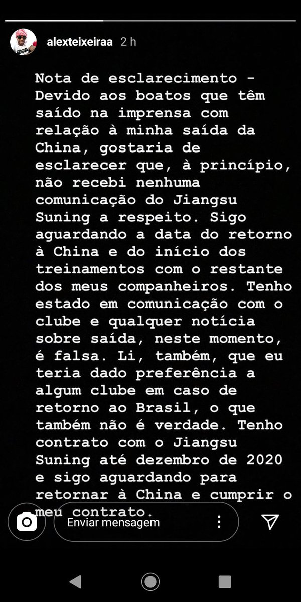 Em seu Instagram, Alex Teixeira desmentiu rumores de que teria dado preferência ao Corinthians, e confirmou a informação que trouxemos na semana passada: os clubes chineses, por ora, não irão liberar seus atletas por empréstimo.