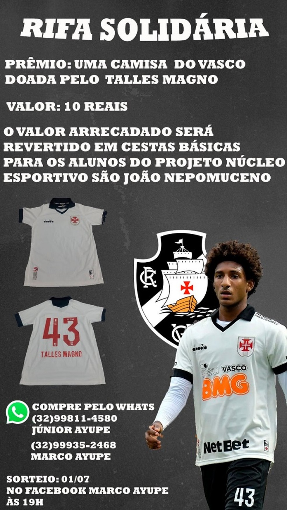 Talles Magno doa camisa do Vasco para rifa de projeto esportivo em São João Nepomuceno (MG)