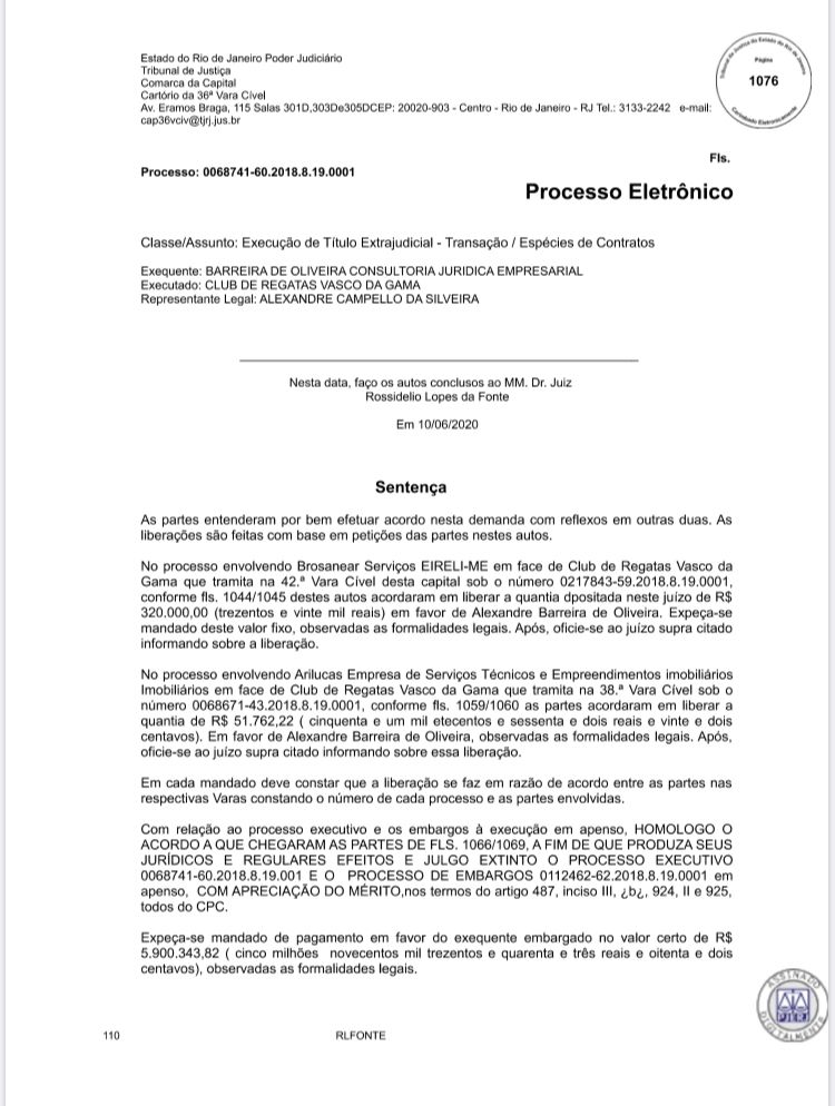 No acordo, homologado pelo Juiz Rossildo Lopes da Fonte, titular do cartório da 36ª vara cível do Rio de Janeiro, outros dois processos movidos pela empresa de consultoria jurídica também foram suspensos. O Vasco, por sua vez, terá que pagar o valor total de R$ 5.900.343,82 à Barreira de Oliveira.
