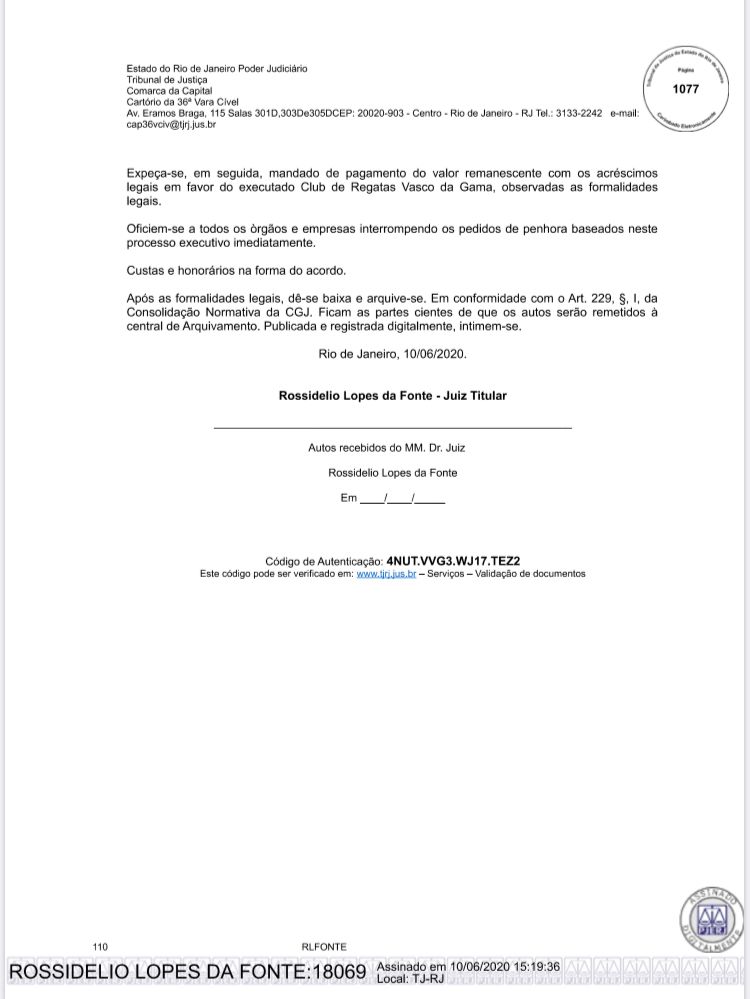 A reportagem do FOXSports.com.br, porém, apurou que o Vasco não sofrerá nenhum tipo de penhora no que diz respeito a esse processo. Ainda na quarta-feira, após uma ação de execução de título extrajudicial movida pelo escritório Barreira de Oliveira, de número 0068741-60.2018.8.19.0001, em função de quatro contratos mútuos entre os dois, foi homologado um acordo entre o Vasco e a empresa, que na sua sentença interrompe os pedidos de penhora baseados no processo inicialmente movido pelo escritório de advocacia.