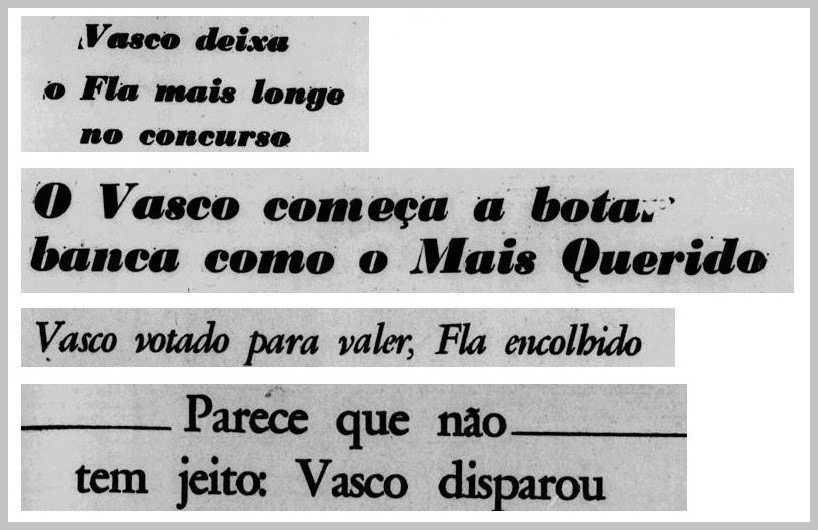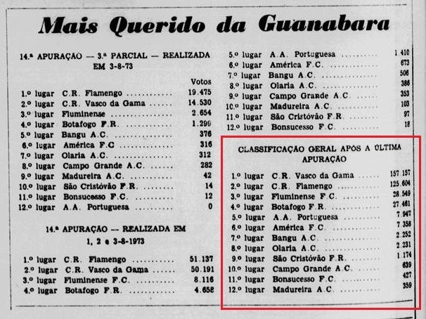 As matérias da época passaram a mostrar que estava cada vez mais difícil tirar o título do concurso de São Januário. Em julho de 73, uma das parciais do Jornal dos Sports mostrava uma vantagem de 40 mil votos do Cruzmaltino. restando apenas duas semanas para o final. Na última contagem, em 4 de agosto daquele ano, o rival até tentou reagir, tendo 19.475 votos contra 14.530. Mas a apuração final mostrou que o Vasco foi o grande vencedor, com 157.157 votos, contra 125.604 do Flamengo, 28.549 do Fluminense e 27.461 do Botafogo.