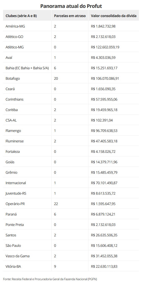 Segundo a lista, apenas nove clubes não devem nenhuma parcela do programa ao Governo – Atlético-MG, Ceará, Corinthians, Fortaleza, Goiás, Grêmio, São Paulo, Ponte Preta e XV de Novembro-RS (os números foram atualizados até o mês de março).