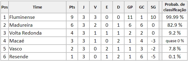 De acordo com o site Chance de Gol, especializado em previsões de futebol com base em estatísticas, a probabilidade do Vasco avançar para as semifinais da Taça Rio é de apenas 7,8%.